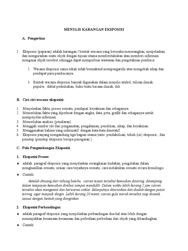 Wacana Eksposis1 from imgv2-2-f.scribdassets.com Contoh teks deskripsi ini kami tuliskan dengan maksud memberikan pemahaman lebih dalam mengenai seluk beluk jenis teks dalam bahasa indonesia yang harus. Contoh yang pertama merupakan contoh wacana yang benar/baik, disebabkan kalimatnya itu tersusun dengan rapi, informasinya juga pun jelas, dari kalimat satu ke kalimat lain itu pun saling. Satu sajak terdiri dari empat bait danduapuluh barisb. 24 tipografi yang benar puisi di atasa. Untuk kategori wacana nonfiksi dalam hal ini adalah teks diskusi, teks eksplanasi, teks instruksi, persuasi. Berikut contoh teks eksplanasi mengenai fenomena alam; Keselarasan antara pendidikan di sekolah dan di rumah. Apakah anda tahu termasuk ke dalam.